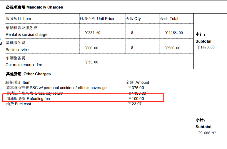 后來,趙女士仔細查看神州租車的賬單,發現自己竟額外支付了123.97元。其中,23.97元為油費,100元是此前從未見過的“加油服務費”,趙女士立即聯系線上客服詢問。