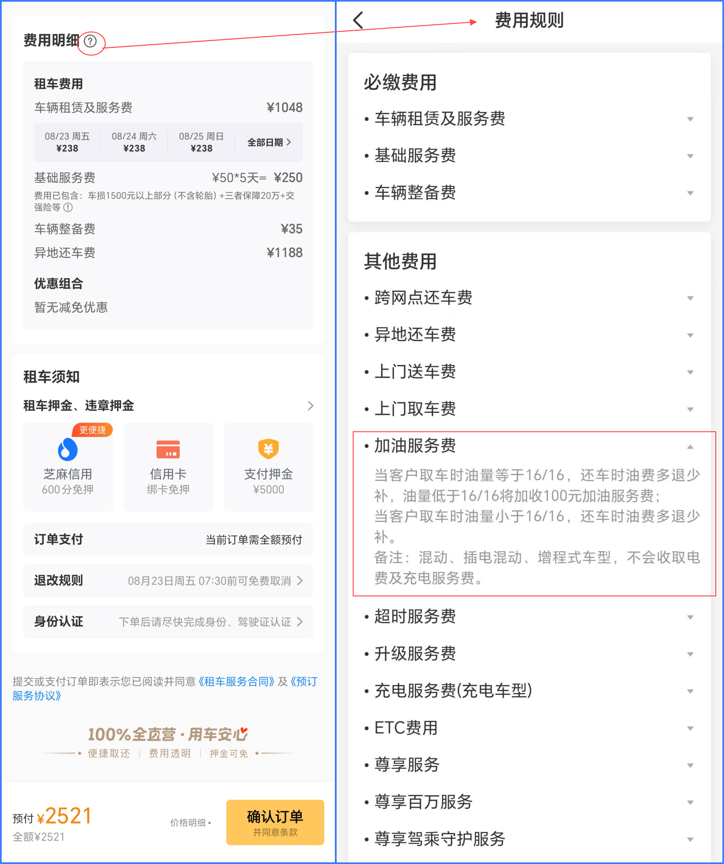 《中國消費者報》在神州租車APP上下單租車,經過仔細找尋,發現必須點開“費用明細”旁邊一個不起眼的圓圈小問號圖標后,才會跳轉至標注著“費用規則”的清單。在“其他費用”一欄中包括了“加油服務費”,點開后灰色小字顯示“當客戶取車時油量等于16/16,還車時油費多退少補,油量低于16/16將加收100元加油服務費”。