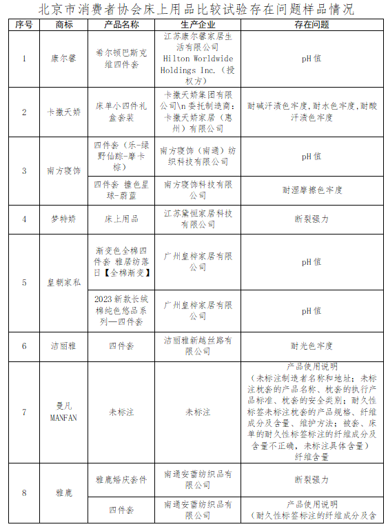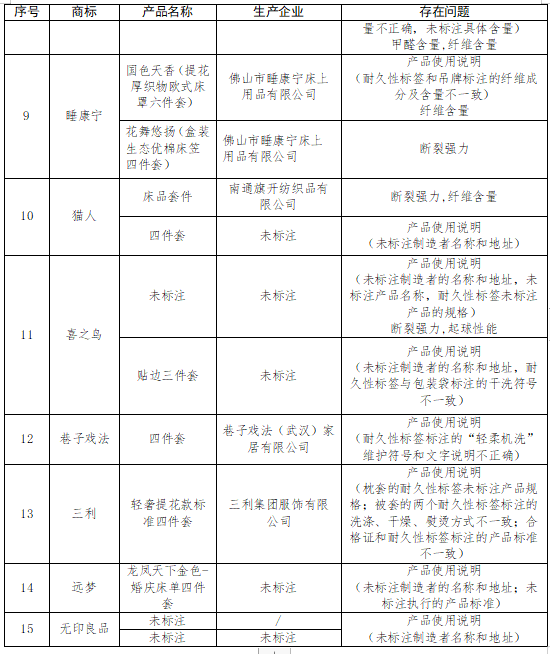 近日,北京市消費者協(xié)會發(fā)布床上用品比較試驗結果,經(jīng)檢測,80件樣品中,雅鹿、無印良品等15個品牌的樣品存在不符合標準問題,問題主要集中在產品使用說明、斷裂強力、纖維含量、pH值、色牢度、起球性能、甲醛含量等檢測項目。