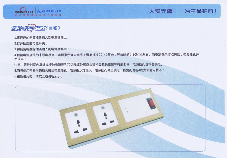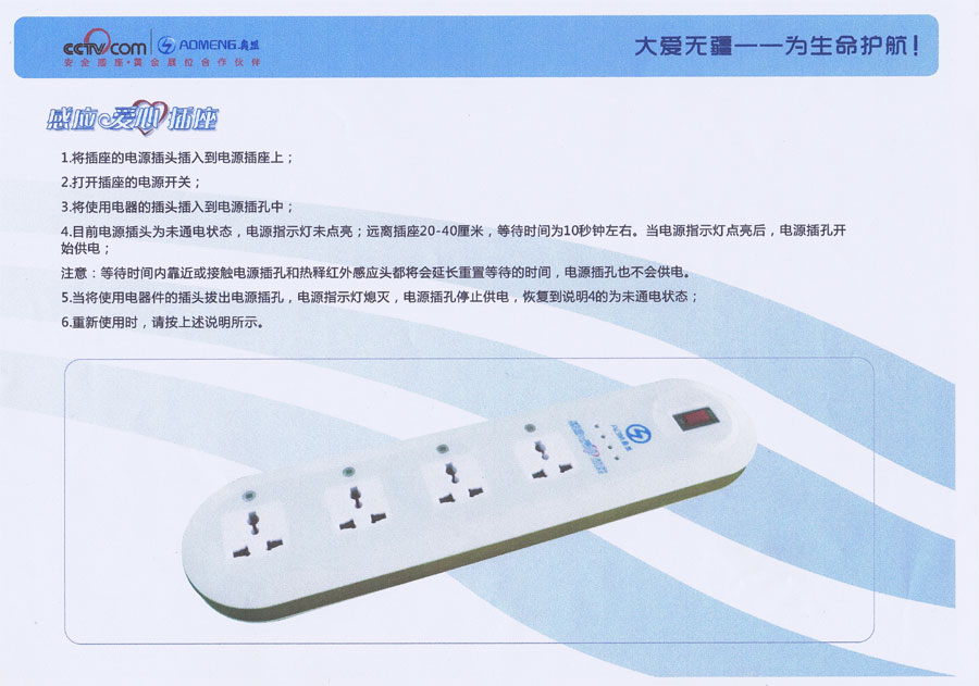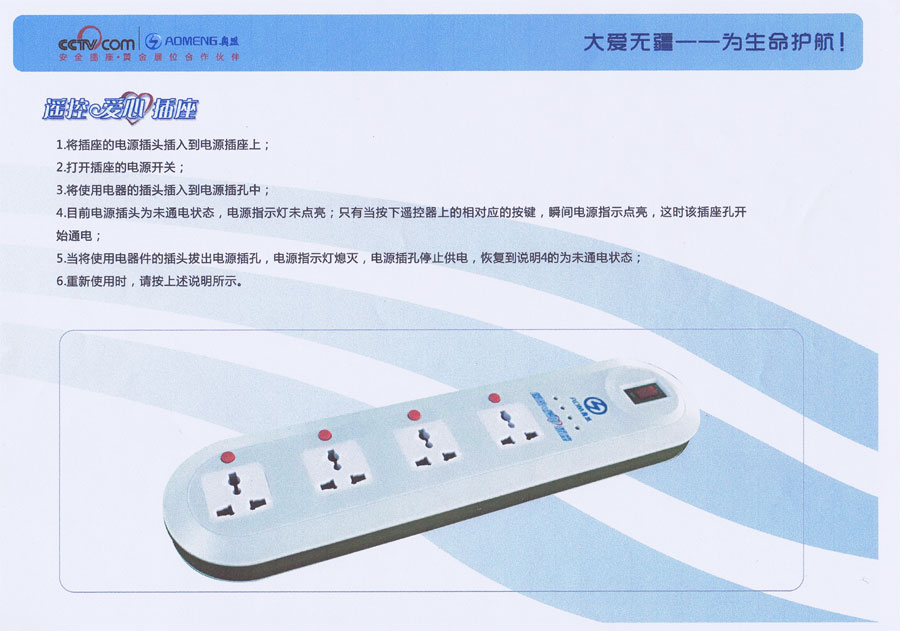 智能愛心安全插座承載著奧盟科技股份有限公司對國家、對社會、對民族深深的責任:承載著奧盟科技股份有限公司未來發(fā)展的希望;承載著所有奧盟人的理想和追求。