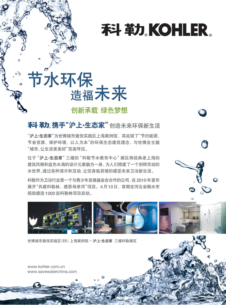 科勒進入中國的這些年,正是中國現代衛浴行業真正發展的黃金時代。作為全球衛浴行業的先行者,科勒帶給中國市場的不僅僅是一件件時尚優雅的衛浴藝術品,更帶來優雅的高品質生活體驗??评罩袊陌l展,也推動了中國廚衛行業與產業的發展成熟。迄今,科勒中國已經擁有10家工廠,近600家常規展廳和21家旗艦展廳。中國市場已經成為科勒全球戰略的重要組成部分。如今,中國眾多的高級住宅、甲級寫字樓和五星級酒店紛紛采用了科勒產品,如北京2008奧運主會場——鳥巢,奧運村,水立方,釣魚臺國賓館、首都機場1號航站樓、長城飯店、昆侖飯店、上海F1國際賽車場、上海JW萬豪超五星級大酒店、明天廣場、中國第一高樓金茂大廈、廣州中國大酒店、廣州白天鵝賓館、深圳機場、深圳大中華喜來登酒店和重慶洲際酒店,世博演藝中心,世博酒店式公寓,世博洲際酒店,世博上海館滬上生態家,世博美國館,萬科世博企業館等。品質卓越,尊貴高雅的科勒產品已經成為中國消費者追求完美家居生活的重要象征。