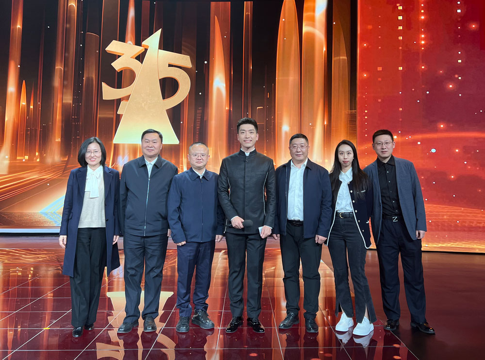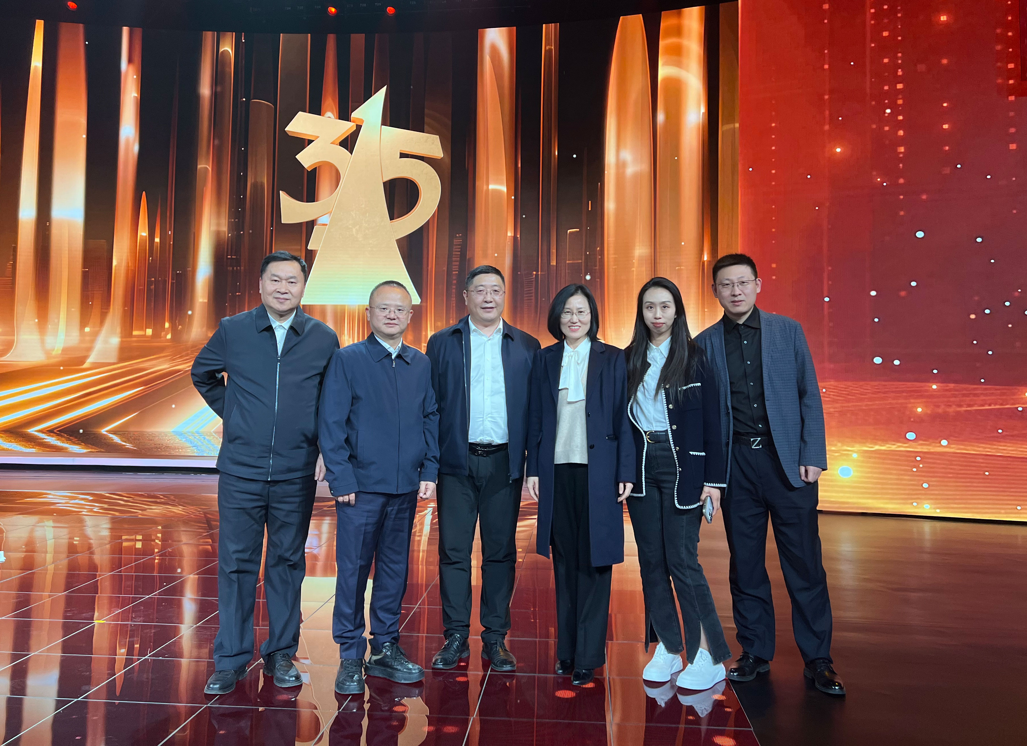 圖為質檢協會副會長王群、副秘書長李昭嫻、會長助理兼企業工作部主任王劍、會長助理兼會員協作發展中心主任劉輝、防偽溯源物流管理服務中心主任王強、會員工作部負責人楊曉東與中央電視臺主持人孟湛東在3·15晚會現場